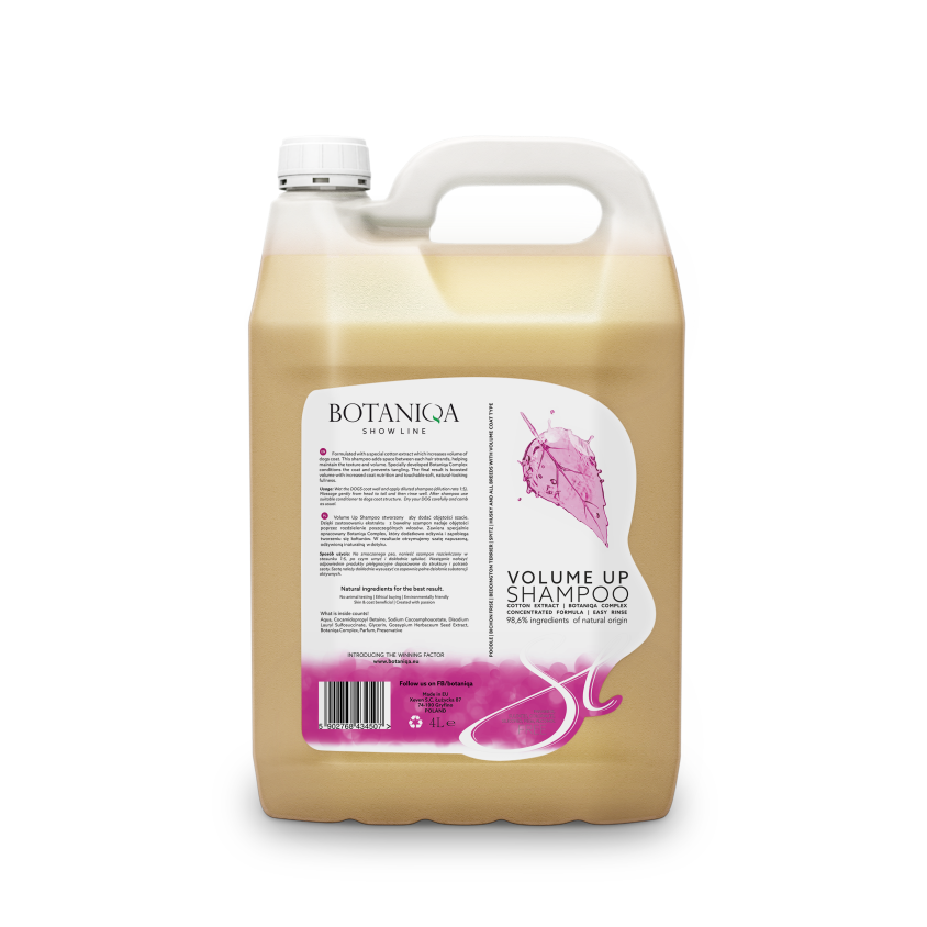 采用特殊的棉花提取物配方,以增加被毛的体积。这种洗护沐浴露在每根毛发之间增加了空间,有助于保持被毛的质地和体积。特别研发的植物复合成分可保护被毛和防止缠结。最终的目的是以增加被毛营养、柔软触感和丰满的自然外观来增加体积。